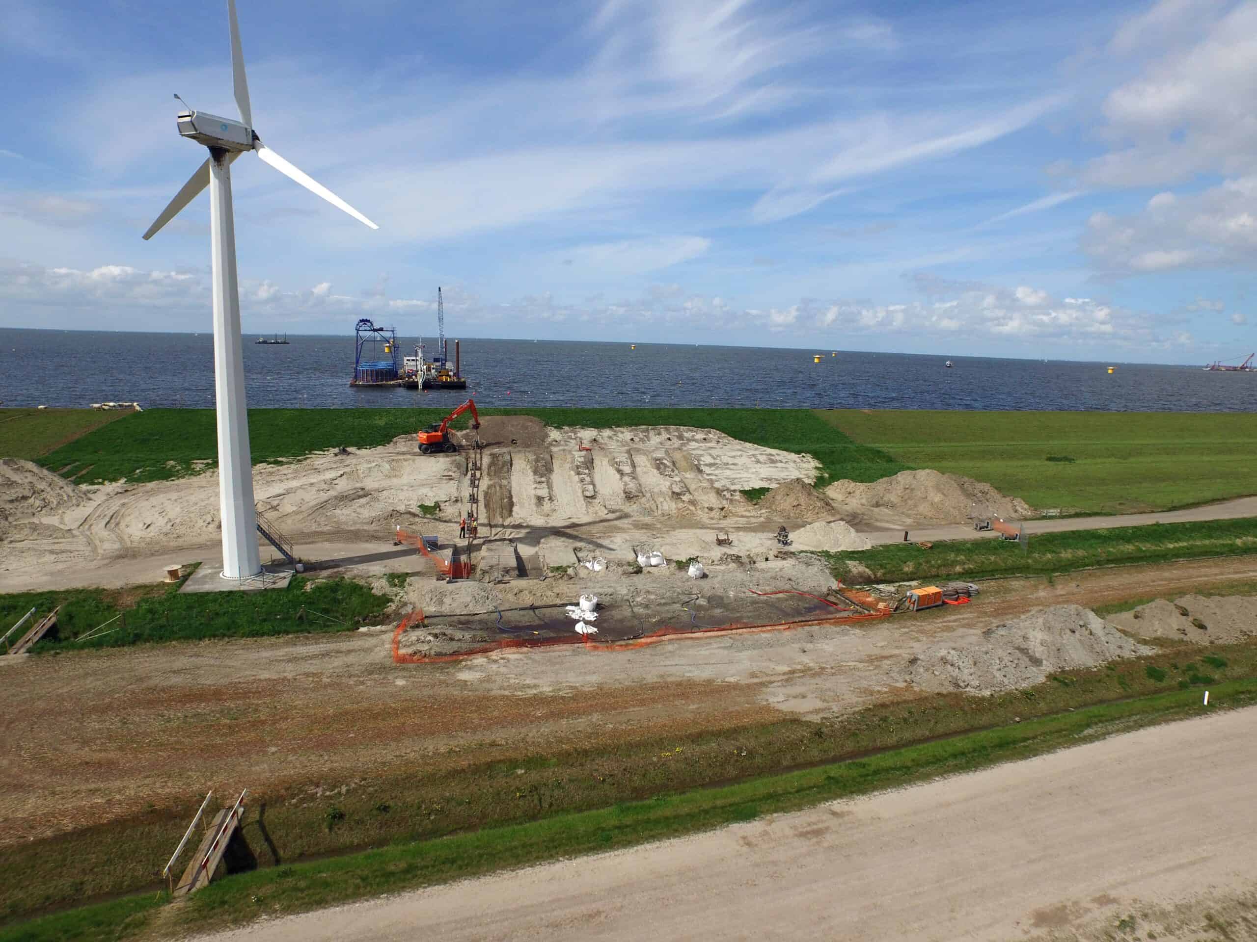 Vandaag is gestart met de aanleg van de eerste elektriciteitskabel tussen de toekomstige windturbines in het water en het hoogspanningsstation dat binnendijks bij Espel gebouwd wordt. De in totaal zes kabels (dikte tot 15 cm) die het windpark met dit station zullen verbinden, worden na elkaar door de vorig jaar al geboorde buizen door de dijk getrokken. De aanleg van de in totaal 44 kilometer aan kabels tussen de windturbines en het land zal ongeveer twee maanden in beslag nemen. Vanaf juli zullen de windturbines met hun torens op deze fundaties geplaatst worden door hetzelfde kraanponton.